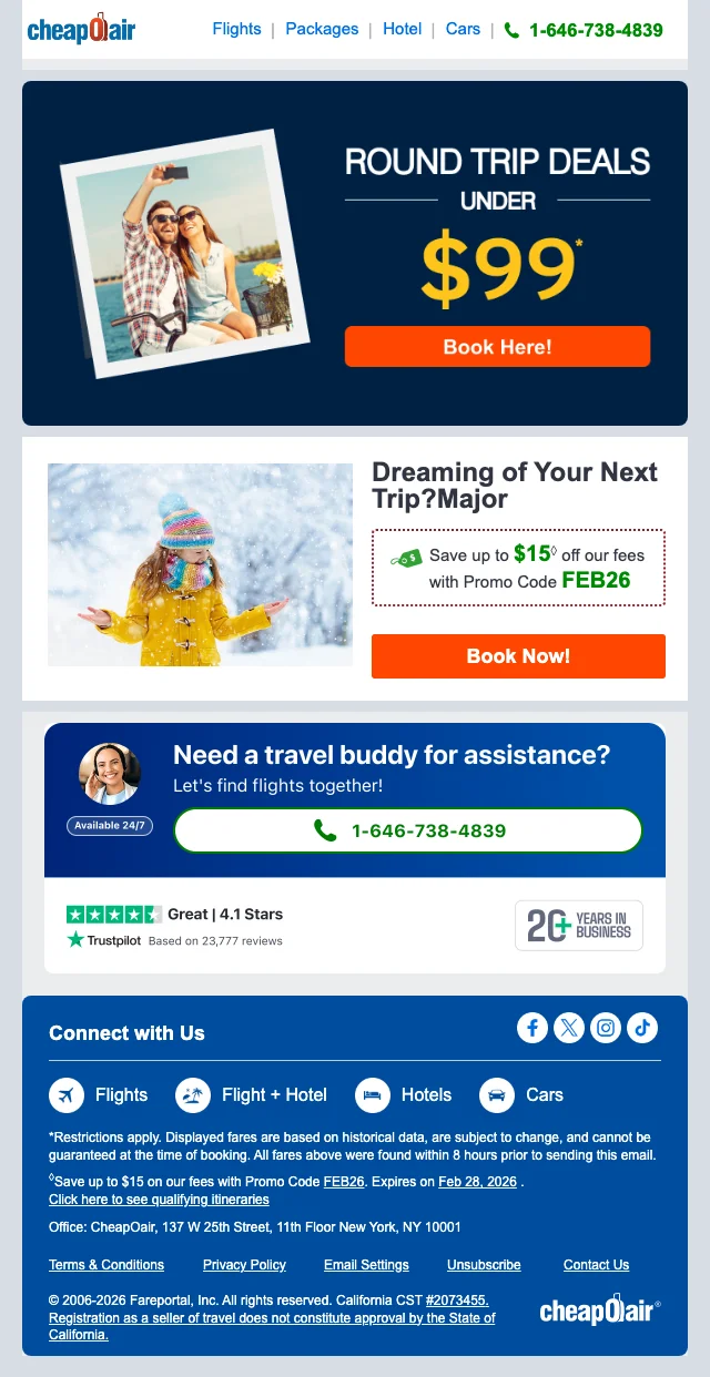 We check all the newsletters from Cheapoair for you to find the best deals. Have a look at their latest newsletters.